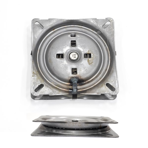 Seat swivel designed to turn 90 degrees left and right, with a spring mechanism that returns the seat to center after rotation. Bolts to a square bolt pattern with approximately 5-3/4" center-to-center spacing. Adds a 3-degree rearward sloping pitch for enhanced seating comfort.
